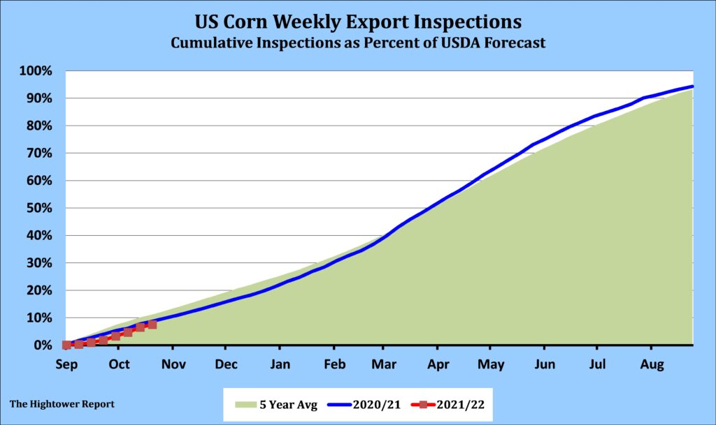 The early rally push the market up to the highest level since October 6, but weak export news and talk of the short-term overbought condition of the market helped to pressure. December corn closed near unchanged after choppy and 2-sided trade. For the weekly crop progress report, traders see corn harvest near 65% complete, 62–68 range, as compared with 52% last week. Higher gas prices should encourage increased ethanol production, but the higher US dollar is seen as a negative force. A more active weather system across the Midwest could slow harvest some, but traders do not see this is a significant longer-term factor. Corn export inspections for the week ending October 21 came in at 545,127 metric tonnes from trade expectations for 750,000-1.2 million tonnes. Cumulative inspections year-to-date are 4,712,999 metric tonnes which is 23.6% below last year. This is 7.5% of the USDA’s forecast for the 2021-22 marketing year versus the five year average of 11.2%. Along the Illinois River, corn bids fell by $0.21 a bushel.