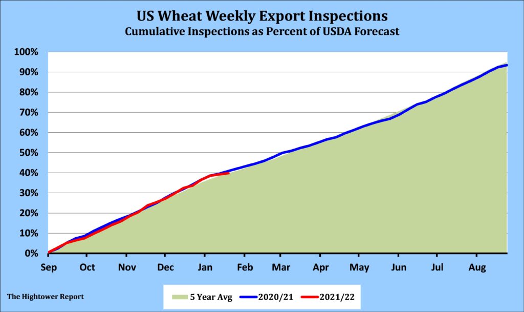 December wheat managed to close higher on the day and near the middle of the 13 ¾ cent range. The early buying pushed the market up to the highest level since August 17. Kansas City wheat closed higher on the day after the early rally to a new contract highs for the second session in a row. Minneapolis wheat traded as high as $10.31 and new contract highs for the fourth session in a row. For the weekly crop progress report, traders expect winter wheat plantings to have reached 81% complete (78-85% range). For the first crop conditions update of the season, traders see 54% of the crop in good/excellent condition with a range of 49% to 62%. Wheat export inspections for the week ending October 21 came in at 140,413 metric tonnes from trade expectations for 150,000 to 450,000 tonnes. Cumulative inspections year-to-date are 9,478,304 metric tonnes which is 14.5% below last year. This is 39.8% of the USDA’s forecast for the 2021-22 marketing year versus the five year average of 39.8%.