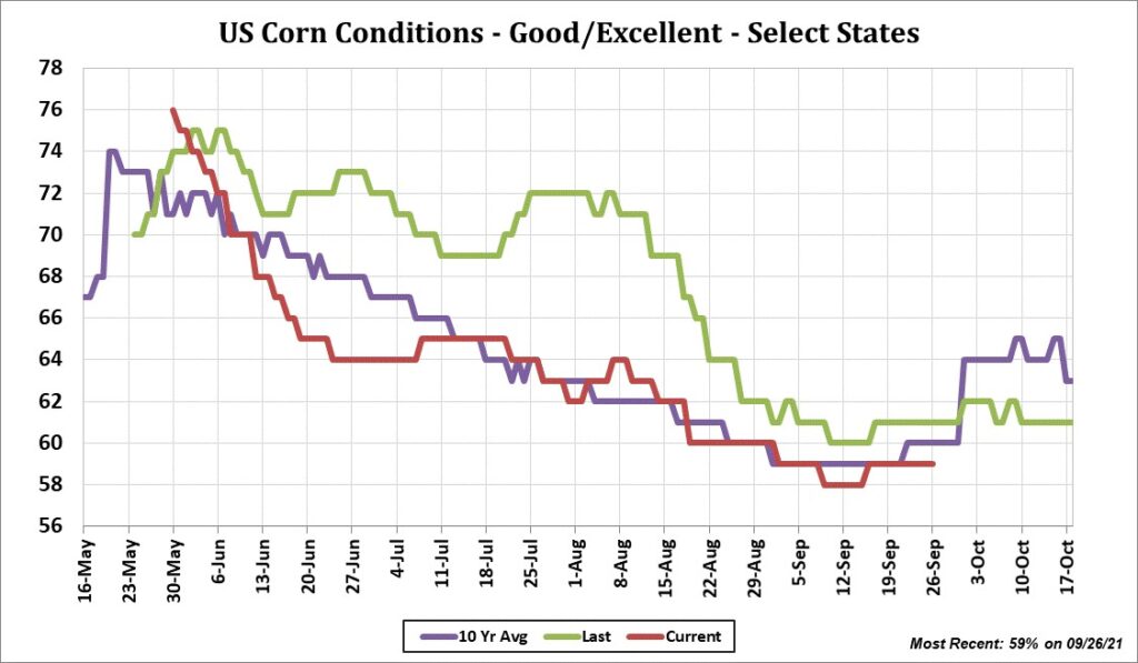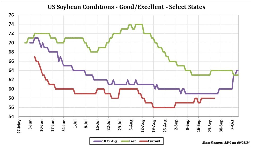 Soybean ended lower on lack of new US soybean export sales to China, increase US soybean supply and continued US harvest. Rains in central Brazil and south Argentina and forecast of rains in north Brazil also offered resistance. Slightly better weekly US soybean exports failed to offer support. Higher energy prices and palmoil prices offered support to soyoil futures versus soymeal. Soymeal traded down to lowest levels since October, 2020. Weekly US soybean exports were near 31 mil bu vs 17 last week and 76 last year. Season to date exports are near 67 mil bu vs 260 last year. Most in the trade could see final US soybean exports closer to 2,050 vs USDA 2,090. Trade est US soybean crop rated 58 pct G/E or unchanged from last week. Trade also estimates that 32 pct of the crop is harvested vs 16 last week.