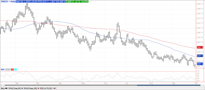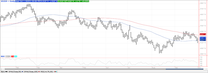 Prices ranged from down $.06 in MIAX to up $.01 in CGO. New contract lows across the 3 classes on early weakness. Dec-25 CGO continues to hold support above the $5 level. Secondary support is at $4.94 ½. Support for the KC weekly is at $4.80. Sept 1st wheat stocks at 2.12 bil. bu. was 77 mil. above the average trade guess and largely due to this year’s production increasing 58 mil. bu. to 1.985 bil., 35 mil. above the range of guesses. The increase largely due to winter wheat acres being revised up nearly 775k, with most of those acres coming from TX and KS. The percentage of acres harvested for grain rose to 77%, still below YA and historical average of 78%. The WW yield was little changed at 54.9 bpa, just below the record yield of 55.3 bpa in 2016. Prior to yesterday report, in the past 15 years, the September report saw production increase only 2 times while being cut 13 times. Spring wheat production at 497 mil. bu. was also above expectations.