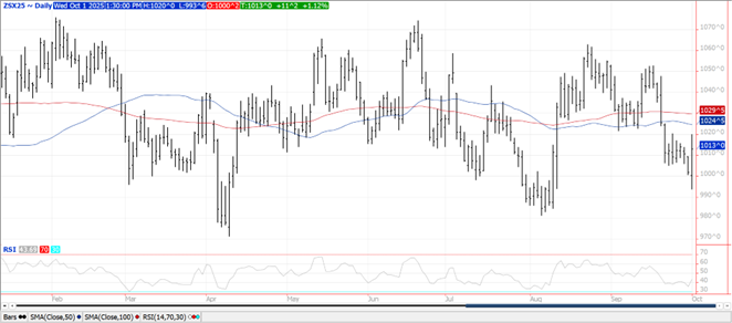 Prices finished $.01 higher in choppy 2 sided trade. Spreads were mixed and little changed. Dec-25 closed back above its 50 day MA after trading below the September low overnight. Prices recovered in sympathy with higher soybeans following Pres. Trumps midday social media posts. Next support is at $4.00 followed by the contract low at $3.92. With old crop stocks now well over 1.5 bil. bu., the feed usage forecast from 24/25 MY is likely more than 200 mil. bu. too high. This lower usage will also carry into the 25/26 MY as well as cattle inventories remain low with the lack of feeders coming in from Mexico due to the screwworm problem. At this point nobody knows when we’ll get our next production update with the USDA Fed. Govt. on day 1 of the shutdown. Ethanol production from the EIA which slipped to 292 mil. gallons, down from 301 mil. the previous week and down 2% from YA. Production the lowest in 4 ½ months and below expectations. There was 99 mil. bu. of corn used in the production process, or 14.16 mil. bu. per day, well below the 15.4 mbd needed to reach the USDA corn usage estimate of 5.60 bil. bu. Ethanol stocks slumped to 22.8 mil. barrels, at the low end of expectations and below YA at 23.5 mb.