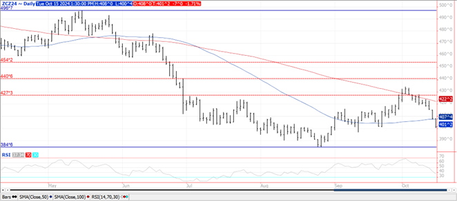 Prices were down another $.06-$.07 today as Dec-24 trading to fresh lows for the month while violating support at the 50-day MA in the process. Spreads were firmer for much of the session however finished mixed. Outside of some shower activity in the Great Lakes region and isolated areas of the ECB, US weather remains ideal for corn and soybean harvest. Export inspections at only 17 mil. bu. were a MY low and well below the 47 mil. bu. needed per week to reach the revised USDA forecast of 2.325 bil. bu. YTD inspections at 186 mil. are up 19% from YA vs. the revised USDA forecast of up 1.5%. Mexico was the only noted taker with 8 mil. bu. EU corn imports since June have reached 5.7 mmt, up 5.6% from YA. Conab estimates Brazil’s 24/25 total corn crop at 119.7 mmt, well below the USDA forecast of 127 mmt. The biggest changes to the global balance sheet from last Friday’s WASDE data was the lowering of old crop exports for both Brazil and Argentina which was partially offset by higher domestic consumption. In Brazil this is largely due to increased usage for ethanol production. Global stocks/use among major exporters virtually unchanged at 9.6%.