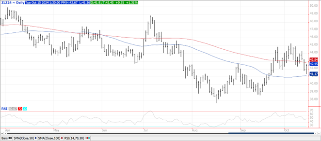 Prices were mixed with beans down $.05-$.10 as spreads rebound, meal was $4 lower while oil was up 30-55. Nov-24 beans and Dec-24 meal fell to 7 week lows before bouncing. After holding support above its 50 day MA support at 41.17, Dec-24 oil rebounded closing just below its 100 day MA. Spot board crush margins rebounded $.03 ½ to $1.62 with bean oil PV increasing to 40.5%. In the US, Week 2 of the weather outlook continues to show above normal temperatures however better prospects for rain in the WCB and northern Midwest. All of Brazil will get rain over the next few weeks supporting planting and early crop emergence, albeit a few weeks later than normal. Australia’s weather bureau joined the CPC in stating the odds of La Nina developing has decreased, however if La Nina conditions develop, it will be weak and short in duration. Export inspections at 58 mil. bu. were in line with expectations and well above the 34 mil. needed per week to reach the USDA forecast of 1.850 bil. bu. Last week’s inspections were revised up by 7 mil. bu. bringing YTD inspections to 189 mil. are down 7% from YA vs. the USDA forecast of up 9%. China took 38 mil. bu. In addition the USDA announced the sale of 131k mt (5 mil. bu.) of soybeans to China. NOPA members crush 177.3 mil. bu. in September, up sharply from the 158 mil. in August and the 165.5 in Sept-23. Crush came in above the range of estimates of 164–177 mil. Soybean oil stocks fell for a 6th consecutive month to 1.066 bil. lbs. down 6.3% from Aug-24 and in line with expectations despite the much higher than expected crush. EU soybean imports as of Oct. 13th have reached 3.52 mmt up 8.3% from YA. Meal imports at 4.9 mt are up 7.2% from YA. Conab estimates Brazilian soybean production for 24/25 at 166 mmt, vs. the USDA est. of 169 mmt. Global stocks/use ratio among major exporters is still expected to rise to nearly 23% in 2024/25, which if realized would be a 6-year high. While Brazil’s crop is going a few weeks later than normal, history shows it will not negatively impact yields if weather is normal moving forward.