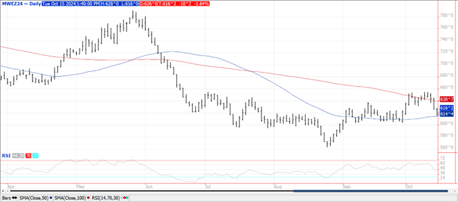 Prices are down $.14-$.17 across all classes today. Dec-24 Chicago barely held support above LW’s low at $5.84. Both Dec-24 in KC and MGEX have violated support at LW’s low. Markets shrugged off news that another Russian missile attack over the weekend damaged 2 civilian vessels and a grain storage facility in Ukraine’s southern Odessa region. The attack killed 1 person while injuring dozens more. Heavy rains fell in Central Ukraine over the weekend, with much lighter amounts in drought areas in the east along with Southern Russia. Last week MM’s bought 9.4k contracts of KC wheat, 6.1k of MGEX while selling 6.5k in Chicago. Their combined short position across all 3 classes is down to 43k contracts, the smallest in 4 months. SovEcon reports Russia exported 1.1 mmt of grain LW with 1.0 mmt being wheat. These are both above the previous week’s sales of 870k tons of grain and 800k of that being wheat. IKAR reports Russia’s export price for wheat ended last week to $230/mt FOB, while up from $223/mt the previous week, this is well below the $250/mt price floor the Ag. Ministry asked exporter not sell below in international tenders.