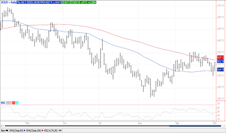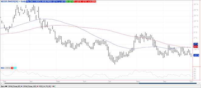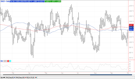 Prices were up $.04-$.05 making session highs in late trade. Spreads also firmed. Dec-25 held support above its 50 day MA at $4.14 ½ on early weakness. Buy stops were triggered upon breaching yesterday’s high. Resistance rests at the 100 day MA at $4.24 ¼. Although StoneX lowered their corn yields 1 bu. to 185.9 bpa, their production forecast was up 160 mil. bu. to 16.737 bil. due to higher acres. Their forecast is still 77 mil. bu. below the USDA forecast from September. S&P Global also lowered their US corn production and yield estimates to 16.707 bil. bu. with an average yield of 185.5 bpa. Yesterday speculative traders bought roughly 10K contracts of corn, cutting their short position to 110k. US corn area in drought rose 2% to 28%. No CFTC-COT data this Friday with the Fed. Govt. shutdown.