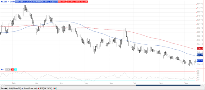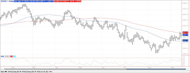 Prices were $.06-$.07 lower today giving back a large part of Friday’s gains. Spreads also weakened. Export inspections at 59.5 mil. bu., were at the high end of expectations and just above the 57 mil. needed per week to reach the revised USDA forecast. YTD inspections at 85 mil. bu. are up 106% from YA vs. the USDA forecast of up 5%. Noted buyers were Mexico – 17 mil. and Japan – 15 mil. The USDA also announced the sale of 149k mt (6 mil. bu.) of corn to an unknown buyer. AgRural estimates Brazil’s 1st crop corn is 17% planted. Safras & Mercado forecast their 1st crop production at 25.48 mmt, up 3% from YA. The CFTC reports money managers were net sellers of 8,442 contracts extending their short position back to 100k contracts as of last Tues. the 9th. Friday’s USDA report showed stocks/use among major exporting countries for the 24/25 MY rose to 7.7%, up from 7.4% in August. New crop stocks/use however inched down to 9.7% from 9.8% the month prior.