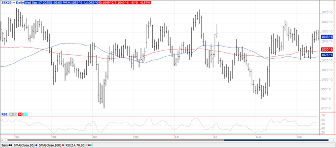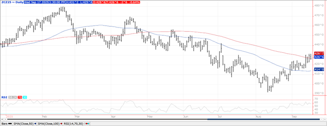 Prices backed up $.02-$.03 in 2 sided trade. Spreads closed steady. Dec-25 close right at its 100 day MA at $4.26 ¾. Ethanol production slipped to 310 mil. gallons in the week ended Fri. Sept. 12th, down from 325 mil. the previous week however up .6% from YA. Production was the lowest in 17 weeks and below expectations. There was 105 mil. bu. of corn used in the production process, or 15.0 mil. bu. per day, well below the 15.34 mbd needed to reach the USDA 25/26 corn usage forecast of 5.60 bil. bu. Ethanol stocks slumped to 22.6 mil. barrels, at the low end of expectations and below YA inventories at 23.8 mb. Implied gasoline demand rose 3.5% to 8.81 tbd, and was up .4% YOY. Stats Canada est. their corn production at 15.5 mmt, in line with the USDA. Speculative traders yesterday reportedly bought 16k contracts cutting their net short position to around 76k contracts. O.I surged almost 25k contracts, so perhaps an indication it wasn’t speculators covering shorts and leaving the corn market, but rather some fresh speculative longs. Tomorrow’s export sales are expected to range from 20 – 75 mil. bu. IMO at current price levels the market is building in expectations for US corn production closer to 16.5 bil., vs. the USDA forecast of 16.742 bil. and ending stocks falling close to 1.90 bil. vs. the current forecast of 2.117 bil.