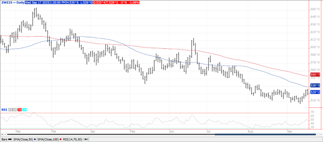 Prices ranged from $.02 – $.07 lower across the 3 classes in 2 sided trade. Spreads have also weakened. Both KC and CGO Dec-25 contracts rejected trade into new highs for the month. Overhead resistance for CGO rests at its 50 day MA at $5.38 ½, $5.30 ½ for KC. Rains this week in the western corn belt won’t have much impact on this year’s corn or soybean yields, however will help recharge soil moisture for this year’s winter wheat crop. Stats Canada raised their all-wheat production forecast 1.1 mmt to 36.624 mmt, consistent with the USDA last week raising their forecast 1 mmt to 36 mmt. Russia’s Ag. Ministry raised their wheat export duty nearly 300% to 495.9 roubles/mt. The higher tax is in effect from Sept. 17th thru the 23rd. Export sales are expected to range from 10-24 mil. bu.