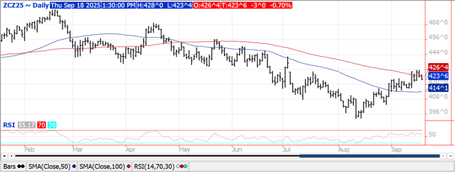 Prices were $.03 lower closing near session lows in 2 sided trade.  Spreads were mixed and little changed.  Dec-25 closed back below its 100 day MA however held above this week’s low of $4.22.  The Trump Admin. and Congress are reportedly working on an aid package for US farmers as they face another year of operational losses given the high input costs and low prices. Export sales at 49 mil. bu. were in line with expectations.  YTD commitments for the 25/26 MY at 938 mil. are up 68% from YA, vs. the revised USDA forecast of up 5%.  Commitments represent 31.5% of the USDA forecast above the historical Ave. of 25.5%.  Noted buyers were Mexico – 16.5 mil., while S. Korea and Japan bought 8 mil. bu. each.  The USDA also announced the sale of 110k mt (4.4 mil. bu.) to Mexico.  Conab is forecasting Brazilian corn acres for 2025/26 at 22.6 mil. HA, up 3.2% from YA with production at 138.3 mmt.  The USDA is using the same acreage forecast however production at only 131 mmt.  Conab is assuming record yields.  US corn acres in drought surged 12% this past week to 25%, the highest since April-25.