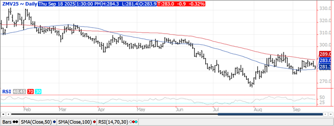Prices were lower across the complex with beans down $.06, meal was off $1 while oil has backed up 60-65 points.  Spreads were mixed and little changed.  Nov-25 beans slipped to a new low for the week with next support at the 100 day MA at $10.30 ¾.  New low for the week in Oct-25 oil as well with support at LW’s low of 49.44.  Oct-25 meal held support at its 50 day MA at $281.30.  Spot board crush margins slipped another $.01 to $1.53 ½ with bean oil PV slipping to 47.4%.  The favorable weather outlook in SA leans bearish for prices.  Rains in Argentina and S. Brazil remain timely.  Scattered rains are also expected to start filling in across EC growing areas of Mato Grosso and MGDS by the end of Sept. bringing an end to their dry season as farmers prepare to plant a record amount of soybeans.  Exports at 34 mil. bu. were in line with expectations.  YTD commitments for the 25/26 MY at 378 mil. bu. are down 36% from YA vs. the revised USDA forecast of down 10%.  Commitments represent 22% of the USDA forecast vs. the historical Ave. of 37%.  Still no sales to China.  Noted buyers were Egypt – 8 mil. bu. while Mexico and Spain purchased 6-7 mil. bu. each.  Soybean meal sales at 182k tons were at the low end of expectations.  Old crop commitments are up 13% from YA, in line with the revised USDA forecast.  Bean oil sales at 49 mil. lbs. brought 24/25 commitments to 2.467 bil., lbs. closing in on the revised USDA forecast of 2.50 bil.  Conab is forecasting Brazilian bean acres for 2025/26 at a record 49.1 mil. HA, up 3.6% from YA with production also a record 177.7 mmt.  Conab and the USDA are both forecasting Brazilian soybean exports at 112 mmt, up from 106 mmt in 24/25.  US bean acres in drought jumped 14% this past week to 36%, the highest since March-25.
