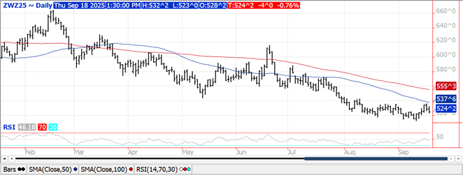 Prices ranged from $.03-$.06 lower across the 3 classes in 2 sided trade.  Spreads were slightly weaker.  US rains will likely not impact corn or soybean yields however will help restore soil moisture in drought stressed areas, beneficial for the winter wheat crop that is currently being planted. Exports at 14 mil. bu. were in line with expectations.  YTD commitments at 481 mil. bu. are up 20.5% from YA, vs. the revised USDA forecast of up 9%.  Commitments represent 53.5% of the USDA forecast vs. the historical average of 51%.  By class commitments vs. the revised USDA forecast are: HRW up 111% vs. USDA up 49%, SRW up 3% in line with the USDA, HRS down 11% vs. down 4%, and white down 10% vs. down 14%.  US winter wheat area in drought increased 6% last week to 44%, a 10 month high.  EU grain group COCERAL is forecasting combined EU and UK soft wheat production at 147.4 mmt, up from 143.1 mmt in July.  Wire services are reporting Iran’s wheat purchase this week from Russia was likely much higher than previously expected.  Volume estimates range from .5 mmt to 2.0 mmt with shipment in Q4 of this year.  The IGC raised their 2025/26 global wheat production forecast 8 mmt to 819 mmt, just above the revised USDA forecast of 816.2 mmt.