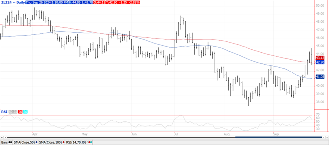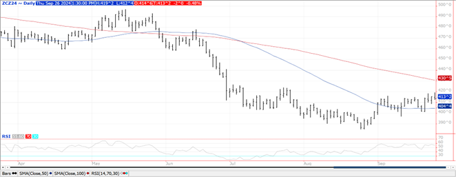 Prices were down $.02-$.03 today while spreads firmed a touch. Dec-24 traded to a fresh 2 month high however failed to challenge resistance at the July high of $4.26 ½. Next resistance is the 100 day MA at $4.30 ½. Support rests at the 50 day MA at $4.04 ½. Hurricane Helene is expected to make landfall along the FL panhandle this evening as a Category 3 storm, perhaps strengthening to a Cat. 4. Sustained winds in excess of 100+ mph is expected to cause significant property and some crop damage. Flooding rains of over a foot in some regions of the SE while 2-3” totals are expected to stretch into SE MO along with southern IL, IN and OH. Little to no moisture for the US plains, WCB and NC Midwest over the next 7 days enabling harvest to accelerate. The USDA announced the sale of 115k mt (4.5 mil. bu.) of corn to Mexico. Exports at 21 mil. bu. were below expectations and bring YTD commitments to 580 mil. bu. still up 17% from YA, vs. the USDA forecast of up less than 1%. Current commitments represent 25% of the USDA forecast, below the historical average of 31%. The only noted buyers last week were Mexico and Columbia both taking just over 6 mil. bu. US corn area in drought fell 1% LW to 25%, still well below the 58% from YA. The Bloomberg survey for next Monday’s USDA report expects Sept. 1 stocks 1.846 bil. bu., up 34 mil. bu. from the Sept. WASDE report and well above the 1.360 bil. from 22/23.