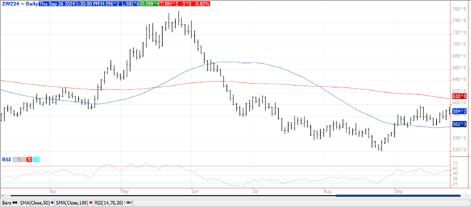 Prices were lower across all 3 classes today with Chicago and MGEX down $.03-$.05 while KC was $.01-$.02 lower. Dec-24 Chicago failed to trade above the Sept-24 high at $5.98 ¾ before pulling back. No change to drought conditions in E. Ukraine and S. Russia into early October. SovEcon lowered their Russian wheat production forecast slightly to 81.8 mmt, widening the gap a touch with the USDA at 83 mmt. Russia has announced plans to expand grain export operations along the Baltic Sea with a long range goal of boosting grain exports by 50% by 2030. In turn, this would reduce their dependance on moving grain thru the Black Sea which has obviously become riskier in recent years since their invasion of Ukraine. Russia’s grain exports in 2023/24 totaled 62 mmt with 90% being channeled thru the Black Sea and only 2.4% thru Baltic Sea ports. US exports at 6 mil. bu. were below expectations and a MY low. YTD commitments at 411 mil. are up 22% from YA, vs. the USDA forecast of up 17%. Commitments represent 50% of the USDA forecast, slightly below the historical average of 53%. US WW area in drought plunged 8% LW to 50%, still slightly above the 47% from YA.