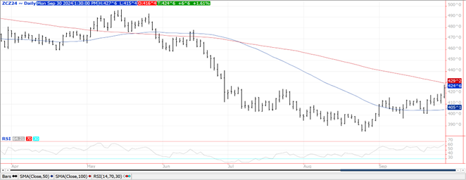 Sept. 1st stocks at 1.760 bil. were 93 mil. bu. below pre-report estimates and down 52 mil. bu. from Aug-24 USDA WASDE report. Today’s data would suggest stronger than expected feed usage in Q4 of the 2023/24 MY. 780 mil. bu. were held on-farm representing 5% of 2023 crop, the highest in 4 years. Adjusting the lower carry-in stocks from 2023/24 would reduce new crop ending stocks to just above 2.0 bil. bu. holding all other variables constant. Export inspections at 45 mil. bu. were at the high end of expectations and in line with the weekly amount needed to reach the USDA forecast of 2.30 bil. bu. YTD inspections at 131 mil. are up 24% from YA vs. the USDA forecast of up less than 1%. Last week money managers were net buyers of just over 4k contracts reducing their short position to just below 131k, the smallest in 4 months. While Canada’s Grain Workers Union has reached a tentative agreement to end a work stoppage in Vancouver the US braces for port strikes along the East and Gulf coasts starting tomorrow. AgRural reports that Brazil’s 1st corn crop plantings has reached 30%. Dec-24 corn briefly traded above the July high of $4.26 ½ with next resistance at the 100 day MA of $4.29 ¼. While spreads remain historically wide they have narrowed nicely from the mid-August lows.