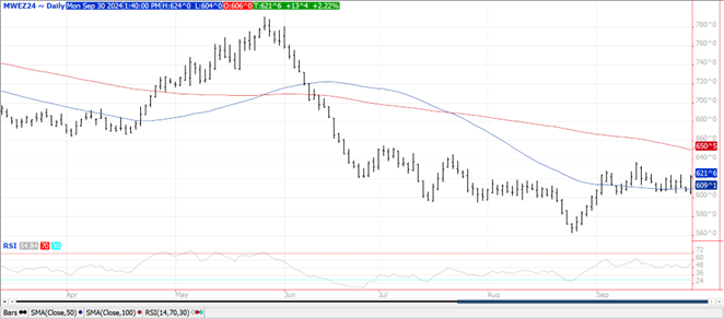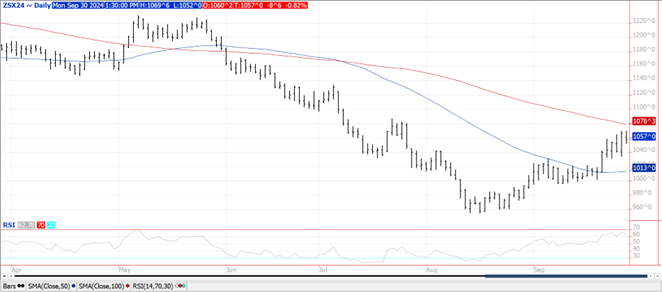 Sept. 1st stocks at 342 mil. were 8 mil. bu. below pre-report estimates, up only 2 mil. bu. from Aug-24 USDA WASDE report. Last year’s crop was trimmed 3 mil. bu. to 4.162 bil. Remnants of Hurricane Helene are still impacting regions of the ECB for the next 24 hours. Dry and warmer conditions have favored harvest activities in the western half of the Midwest. Hot/dry conditions continue to dominate northern growing regions of Brazil however forecasts suggest beneficial rains will arrive starting week 2 of October. Export inspections at 25 mil. bu. were in line with expectations however below the 34 mil. needed per week to reach the USDA forecast of 1.850 bil. bu. YTD inspections at 71 mil. are down 3% from YA vs. the USDA forecast of up 9%. China took just over 7 mil. with 5 mil. going to Germany. Last week money managers were net buyers of just over 47k contracts of beans reducing their short position to 75k contracts, smallest in 3 months. MM’s were also net buyers of nearly 32k bean oil and 18,500 soybean meal. AgRural reports that Brazil’s soybean crop is 2% planted, vs. 5% YA. Today’s EIA data showed biodiesel and RD capacity actually dropped nearly 300 mil. gallon in July to 6.620 bil. gallons with all of the decline coming from renewable diesel. Combined production of biodiesel and RD dropped 1.3% in July to 458 mil. gallons., still the 2nd highest monthly production figure ever reported. Bean oil usage for biofuel production slipped to 1.139 bil. lbs., down 10% from June and down 10.5% from July-23. In the first 10 months of the 24/25 MY bean oil usage has reached 10.691 bil. lbs. up 6% from YA vs. the USDA forecast of up 4%. To reach the current USDA forecast of 13.0 bil. lbs. bean oil usage in August and Sept will need to reach an average of 1.155 bil. lbs. per month vs. the 3 month average of 1.161 bil. Nov-24 beans were able to scratch out a fresh 2 month high however failed to challenge the 100 day MA at $10.78 ½. Dec-24 meal reached a fresh 3 month high before pulling back.