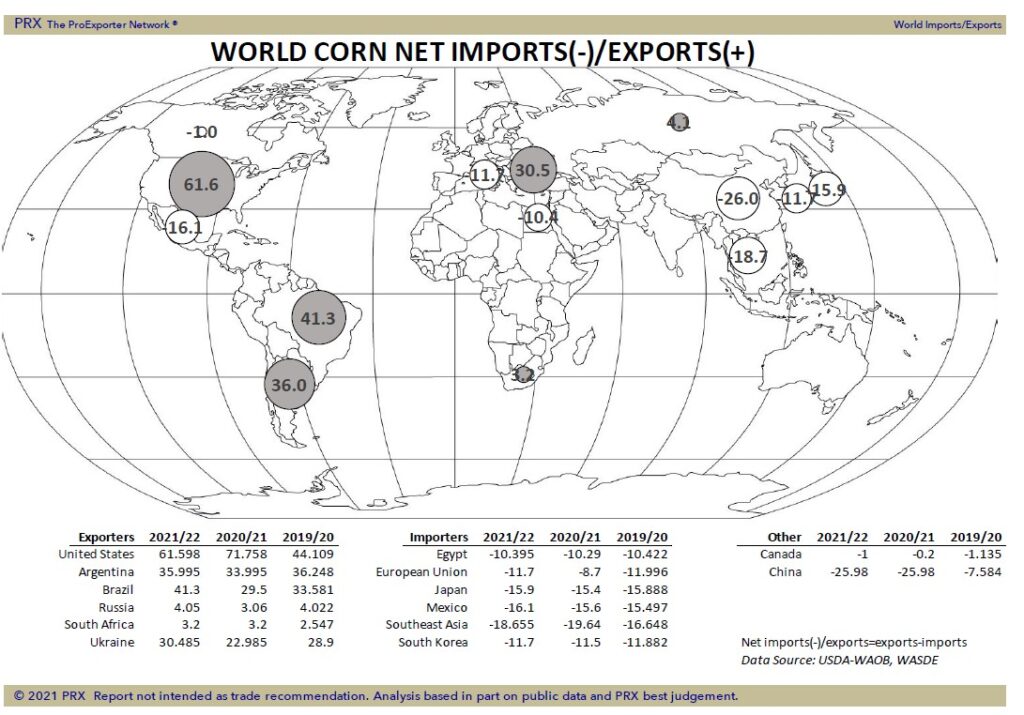 Corn futures traded higher. Talk of hot and dry upper US west Midwest weather late next week offset rains moving across parts of NE and IA. CU is back near the bottom of the July 6 gap. Need to trade near 5.88 to fill the gap. Weekly US corn export sales are estimated near 100-900 mt vs 371 last week. USDA est that South America will export 27 mmt of corn July-Sep. Some feel lower Brazil crop and struggling Argentina export logistics could suggest exports 10 mmt or 400 mil bu lower than USDA est. This could increase demand for US exports. Some feel market could be trading a 178 US corn yield which could be adequate for demand. Managed funds were net buyers of 14,000 corn. We estimate funds to be net long 226,000 corn. Grains open interest remains low. Managed funds may be waiting for more weather data and USDA August report to either add to longs or go short. There was some talk today that IL corn yield could be lower than expected. This and below average yields in MN, IA, SD and ND could drop US corn yield below 175. Some feel US 2021/22 corn carryout could be closer to 1,000 mil bu vs USDA 1,432. Each 1 bpa below 179 could reduce the carryout 90 mil bu.