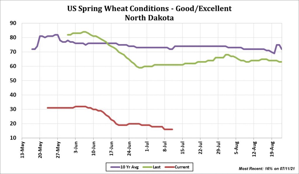 Wheat futures ended higher. Dry weather across NA HRS crop areas pushed MWU to new higher. This is the first time MWU has traded over 9.00 since October, 2012. WU ended near 6.92. Range was 6.70-6.94. 6.94 is near the July 1 high. WU saw the biggest weekly gain in 4 years. KWU is near 6.51. Range was 6.37 to 6.60. NASS est US HRW crop near 805 mil bub vs 659 last year. End stocks near 365 vs 426 ly. Drop is HRS crop could increase HRW domestic use. NASS est US SRW crop near 362 mil bu vs 266 ly. End stocks are est near 105 vs 85 ly. China surprised the market today by buying US SRW. NASS est US HRS crop near 305 mil bu vs 530 ly. End stocks near 237 vs 302 ly. IKAR est Russia wheat crop near 81.5 mmt vs 83.5 previous and WOB 85.0. Lower US, Canada and Russia crops could tighten World supplies. WOB est World crop near 792 mmt vs 775 ly. Exports at record 204 mmt. End stocks near 291 mmt vs 290 ly. Canada could be 21 vs WOB est of 31.5.