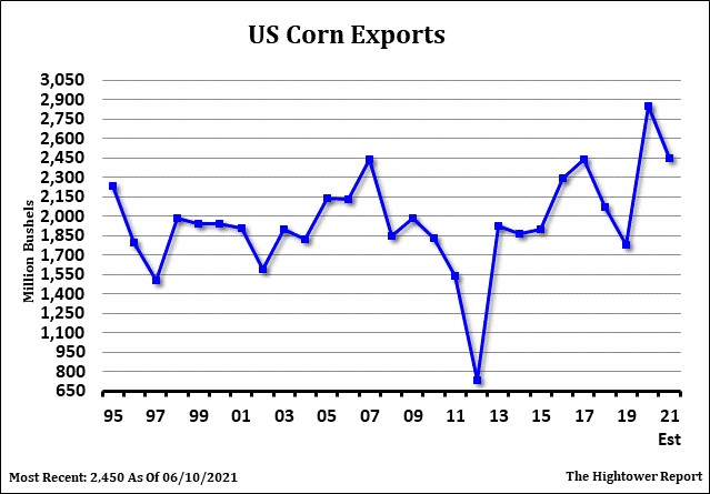 Corn futures traded lower. Fact that US Ag China attaché lowered China 2021/22 corn imports from 26 mmt to 20 is offering resistance to corn futures. This despite a 2 week US north plains and NW cornbellt warm and dry forecast. There is talk that China has bought 12.0 mmt US corn already and 6.0 mmt from Ukraine and 1.0 mmt from Brazil. China does have an additional 7.0 mmt of corn TRQ for imports. Key could be if China hog numbers rebound from this years lows. The amount of corn China buys from US will be key to if prices trend higher from here or lower. Informa adopted US 2021 92.7 planted corn acres. Their July 1 yield is 176.0 which suggest a crop near 14,874 mil bu vs WOB 14,990. WOB July S/D can adjust corn harvested acres and yield. Informa also lowered Brazil corn crop to 87.0 mmt vs WOB 98.5. Ukraine increase their corn crop to 37 mmt vs 30 ly. US May census corn exports were 334 mil bu or 20 above inspections. Sep-May census exports are near 2,148 or 173 mil bu above inspections. US court of appeals vacated a Trump ruling allowing for E15 summer gas sales. Some feel impact on corn demand could be small. NASS est of US corn acres and June 1 stocks were lower than expected. Nearby corn futures range was 6.36-7.44. Tuesday US Midwest July weather forecast will be key to prices.