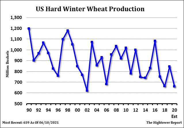 Wheat futures traded lower. Chicago and KC wheat continues to follow US corn futures lower. MInn wheat maintained a large premium to Chicago and KC wheat due to concern about US and Canada HRS 2021 crops. There is debate about July US west Midwest weather but most weather maps agree that US north plains and Canada prairies will be mostly warm and dry. Informa est US 2021 all wheat crop at 1,797 mil bu vs WOB 1,898. They est winter wheat crop at 1,353 vs 1,309, HRW 804 vs 771, SRW 354 vs 335 and white winter 195 vs 202. NASS will release first spring wheat and durum crop est July 12. Informa est the HRS crop at 397 vs 586 ly and Durum 47 vs 69 ly. Those may be high. Informa dropped Canada wheat crop 1 mmt to 31.7. They raised EU crop 2 mmt to 137. They raised Russia wheat crop 3 mmt to 85. Kazakhstan wheat crop was lowered 1 mmt to 13. India wheat crop was lowered 3 mmt to 108.8. NASS US wheat acres and June 1 stocks were near trade est. Nearby Chicago wheat range this week was 6.27-6.83, KC 6.00-6.61 and Minn HRS 8.05-8.68.