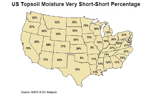 Wheat is wheat. Drier US HRS 2 week forecast is helping Minn futures. Some still feel MWU could test 9.00-9.50. Lower WA and OR white wheat ratings could also support cash prices there. NASS rated the US HRS crop at only 16 pct G/E vs 70 ly. Some ND farmers are slowly zero out spring wheat fields. Manitoba Canada provinces issued a crop disaster warning due to dry weather. World wheat trade is increasing but east Europe and Black Sea prices are still lower than US. Some feel US crop could be closer to 1,790 mil bu vs NASS 1,898 and carryout near 670 vs WOB 770. WU recent range has been 6.15-6.94. WU traded below the 200 day moving ave near 6.38. There is a gap from 6.38 to 6.48 that offers strong resistance. KWU made new lows for the move. 47 pct of US winter wheat crop is harvested vs 51 ly. KS is 62, MO 66 and OR 2. WA rating was only 20 pct G/E, OR 12. MWU held support near 7.93. Gap is from 8.05-8.26.