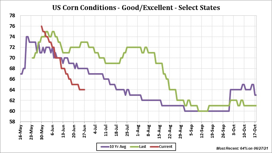 Corn futures ended mixed. CN ended up 19 cents and near 6.94. The 1.35 inverse over CU suggest tight old crop supply going into deliveries, lack of grain moving especially to the export channels and lack of deliveries. Recent rains over north Illinois could raise water levels on Illinois river and limit barge loadings. Exporters still need to buy cash for exports. Tomorrows June 1 corn stocks estimates will be critical to see how much corn is in the country and pct on and off farm. Crushers appear to have good ownership into late August. Also tomorrow USDA will revise US 2021 corn acres. Trade expects 93.8 million vs 91.1 in March. Not only is the actual number key but if acres increase where is the increase? In NW where summer weather could be warm and dry or in east where conditions are improving . June 1 US corn stocks are estimated near 4,130 mil bu vs 5,003 last year. USDA rated US corn crop 64 pct G/E vs 73 last year. 33 pct of acres in IA,MN,ND and SD ratings suggest below trend yields. 35 pct of acres in IN, KY, WI, NE, OH and TN ratings suggest yields above trend. Stats Canada est 2021 corn, oats and barley aces near 15.2 million acres vs 15.6 expected and 14.9 ly. Corn futures rallied on talk that frost/freeze in South Brazil could drop their corn crop closer to 87-88 mmt vs USDA June guess of 98.5 and 102.0 last year. USDA World corn export matrix includes Brazil exporting 14 mmt of corn June-Sep. So far, June exports have been only 94 mt.