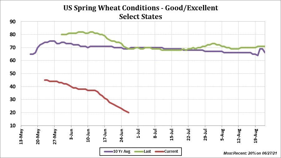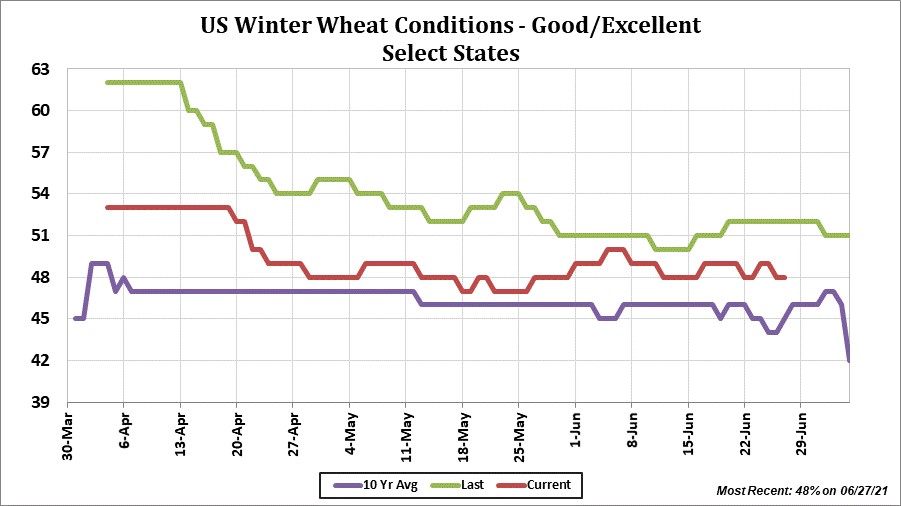 Wheat futures ended lower. Talk of higher US 2021 HRW and SRW crops and slow demand for US wheat exports offered resistance into July deliveries and USDA June stocks and acreage report. USDA is expected to estimate US 2012 wheat acres near 46.0 million vs 46.4 est in March. June 1 US wheat stocks are estimated near 861 mil bu vs 1,028 last year. There are reports of low protein in US 2021 HRW crop. There is also some concern that more rain could increase concern for disease in US SRW crop. USDA est that 33 pct of US winter wheat crop is harvested, IL 63, MO 51, KS 41, OK 80 and TX 75. USDA also estimated US spring wheat crop down 7 to 20 pct G/E and a 33 year low. ND is rated 20 pct G/E with 42 pct of the crop headed. Stats Canada est 2021 All Wheat Acreage at 23.357 mln vs expected 23.3 and 2020 24.982. 2021 Durum wheat acreage at 5.531 mln vs expected 5.5 mln acres and 2020 5.689 mln and 2021 Spring Wheat acreage at 16.477 mln vs 2020 17.926 mln acres. Canada farmers planted more canola and less wheat acres.