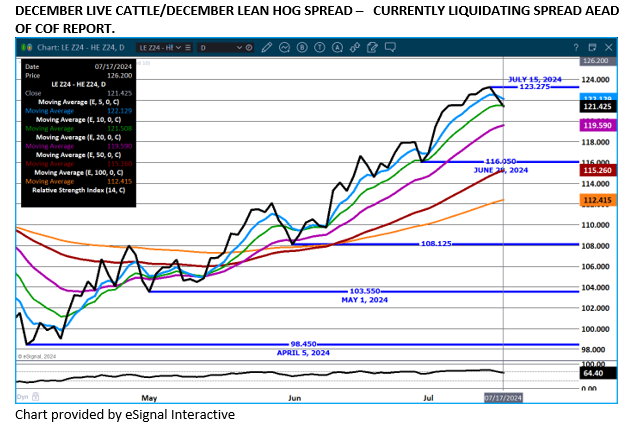 Lately, there has been a slight increase in slaughter and weights remain close to 30 pounds over a year ago.  Beef imports are huge.  The question is, are packers and beef wholesalers storing loins and rib primals for Labor Day or are they will the allow prices to further deteriorate?  It’s about time for Live Cattle to start closing the cash and futures spread. With the wide difference, although there is still plenty of time until first notice day for august live cattle, the difference indicates cash prices are likely ahead for a steep drop between now and first notice day.