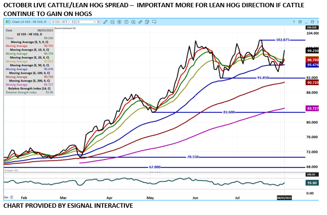 Live Cattle trade volume was moderate Thursday. Spec traders were bear spreading Live Cattle and also buying cattle and selling hogs. Choice boxed beef continues to move down.
