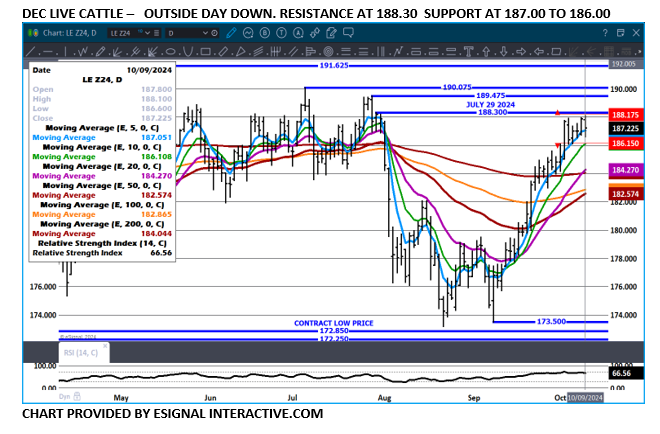 More hogs are moving in North Carolina.  North Carolina is the third largest hog producing state with several of the largest corporate “factory” farms in the US. Many farms are located where hurricane Helene damaged county roads.  Roads are mostly open but 2 lane roads are in many areas cleared to 1 lane.  Last week the CME Pork Cutout was up $1.36 compared to a week ago. The 5 day daily pork carcass price was up 68 cents.  The CME Lean Hog Index up 73 cents.