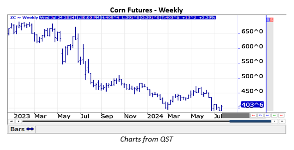 The USDA cut corn old crop 23/24 ending stocks 145 mil. bu. to 1.877 bil. as feed usage and exports were both raised 75 mil. bu. Stocks were 165 mil. below expectations and below the range of guesses. 2024 production at 15.10 bil. was in line with expectations, following the higher acreage data from June. As expected, there was no change to the record U.S. yield forecast at 181 bpa. New crop usage was raised 100 mil. bu. with feed usage also up 75 mil., while exports were increased 25 mil. despite the historically slow start. New crop ending stocks at just below 2.10 bil. were well below the average trade estimate of 2.30 bil. Since the USDA reports, the market seems skeptical of the USDA usage figures, noted they will have to prove themselves over time, while also anticipating higher yields down the road.