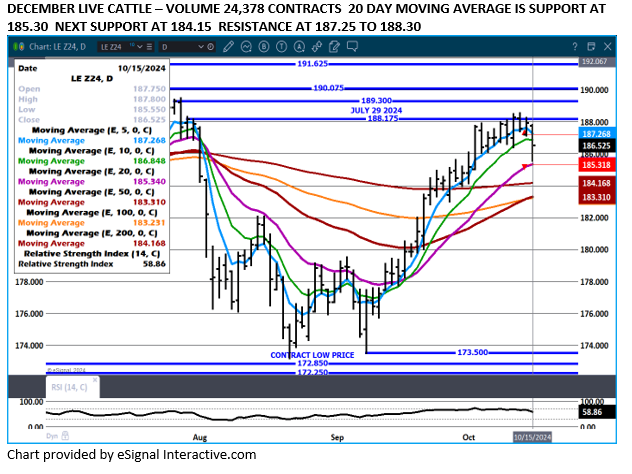 Trade volume was moderate Tuesday as Live Cattle futures turned lower.  December Live Cattle dropped to the 20 day moving average and moved off the low settling below the 10 day average the first time since September 10th.  October Live Cattle were lower as traders used the larger packer buy of last week as bearish for cash prices this coming week.