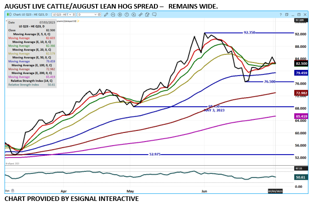 Monday futures trading was light. A few traders are beginning to roll out of August to September. Live Cattle spreaders are bear spread and according to the last COF report should remain bear spread. It’s July and a non-spot month which means speculators will dominate trading.