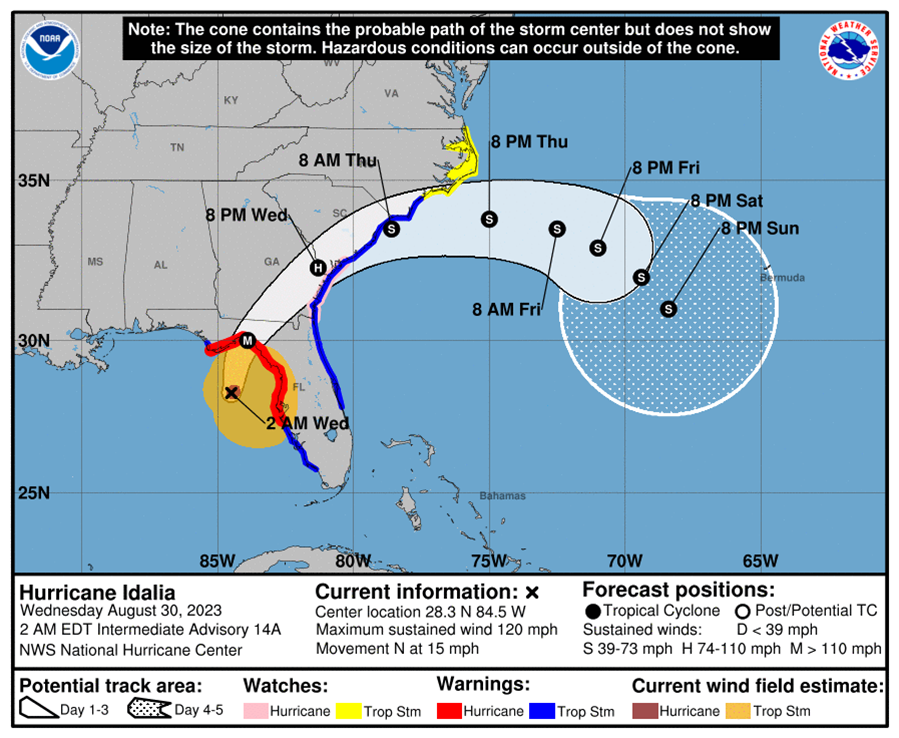 Idalia’s maximum sustained winds reached 130 miles (215 kilometers) per hour, with “catastrophic storm surge” nearing the state’s Big Bend region, the US National Hurricane Center said in an update at 5 a.m. Eastern time.