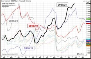 Despite some volatile trading days, speculators have not largely altered their unusually bullish views in Chicago corn over the last month, though they had turned a little friendlier toward beans in the latest week. Optimism faded in recent sessions, however, as the U.S. government projection of domestic corn supply was heavier than predicted. In the near term, investors are focused on the required record export pace, but next year’s supplies are also on the radar as the upcoming marketing year is just around the corner.
