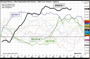 Speculators’ bullishness toward Chicago-traded grains and oilseeds has hovered near record levels since late last year as global demand accelerates and supplies tighten, though various market participants have recently been in the driver’s seat when it comes to the persistent rally, especially in corn. In the week ended May 4, speculators in the “other” category increased their net long to 133,068 futures and options contracts from 107,963 a week earlier according to the U.S. Commodity Futures Trading Commission. That coincided with a 6.5% gain in most-active futures.