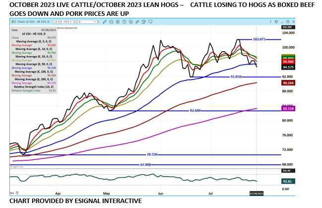 August Live Cattle on Friday settled at $178.15. The 5 day negotiated steer price is $185.56. Next week, spread between cash and futures should narrow. The high temperatures are and have been a big problem in the Southwest but feedlots are also very dusty raising concerns about health of cattle.