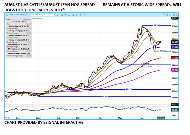 The larger than expected placements on the COF report suggest traders will continue to widen bear spreads during a time when beef sales slow. Trade volume was light Thursday with August by far the most actively traded contract as traders moved it higher to narrow the difference between August and June and higher cash cattle prices. Volume is likely to be light Friday with large funds waiting to come back in July, the 2nd half of 2023.