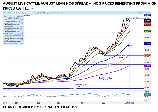 Tuesday’s Live Cattle trade volume was moderately active. Tuesday spec traders were bull spreading. Tuesday, June 5th , June Live Cattle settled at $179.82  and the 5 day negotiated AVERAGE steer price was $182.78, narrowing June Live Cattle $2.96 under cash.