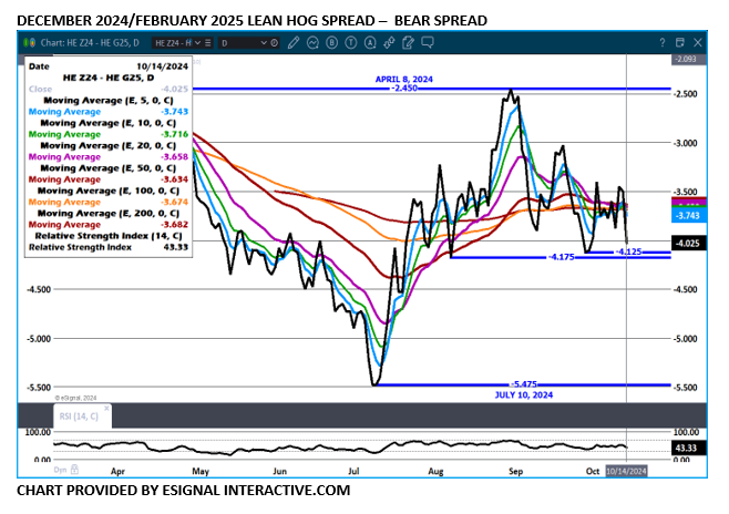 Monday Lean Hog trading was lower with active bear spreading from December through April. December dropped to the 20 day moving average while months in front drop to or slightly below the 10 day moving average. Volume was moderate. Pork on the daily market was up 50 cents and the 5 day carcass average was off 22 cents. Pork prices have been very slowly drifting lower.