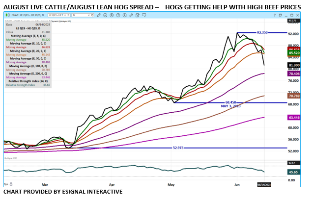 Live Cattle had and outside day down helping to confirm the reversal on June 7th. Volume was just moderate with August Live Cattle volume 27,879 contracts. Boxed beef movement has been light. Packers are going to buy just enough cattle to fill previously contracted beef orders and the few orders for the daily market.