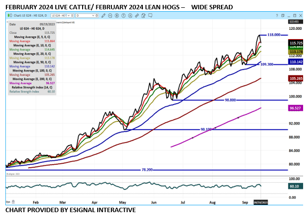 Lean hog trade volume was light Monday and again on Tuesday. Spec traders, similar to the trading on Monday were unwinding bear spreads from December 2023 on out. October Lean Hogs settled at $84.85 as futures moves nearer to the latest index at $86.81. Pork prices have moved up over the past two weeks but it appears with the 5 day carcass average at $99.54, it has hit a resistance around $100 level as it did this summer.