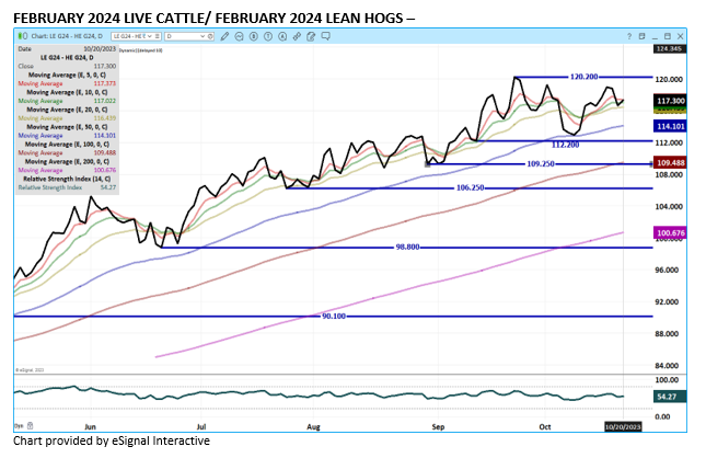 The COF report is bearish. There were more cattle on feed and placements were well above trade expectations. Marketings were low, but close to expected. After Monday, Live Cattle will trade the beef market for December and spec traders will continue bear spreading into 2024. Going forward into the end of the year, trading will depend on the beef market and the demand for rib and loin primals.